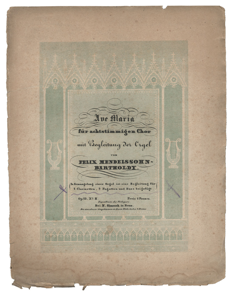 Ave Maria / für achtstimmigen Chor / mit Begleitung der Orgel / von / FELIX MENDELSSOHN- / BARTHOLDY. / (In Ermangelung einer Orgel ist eine Begleitung für / 2 Clarinetten, 2 Fagotten und Bass beigefügt) / Op. 23. No. II.