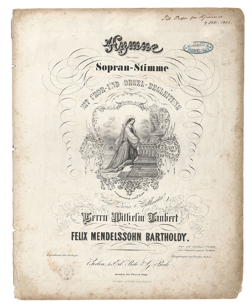 Hymne / für eine / Sopran-Stimme / MIT CHOR- UND ORGEL-BEGLEITUNG / componirt und dem / Königl. Preuss. Kapellmeister / Herrn Wilhelm Taubert / zugeeignet von / FELIX MENDELSSOHN BARTHOLDY.