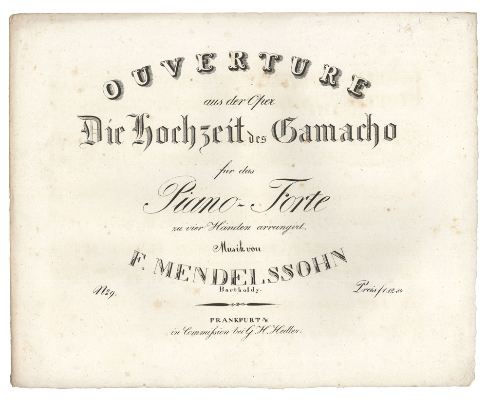 OUVERTURE / aus der Oper / Die Hochzeit des Camacho / für das / Piano-Forte / zu vier Händen arrangirt. / Musik von / F. MENDELSSOHN / Bartholdy. / N° 9.