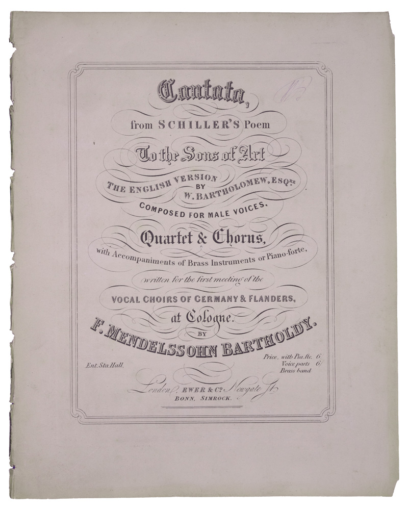 Cantata, / from SCHILLER’S Poem / To the Sons of Art / THE ENGLISH VERSION / BY / W. BARTHOLOMEW, ESQ.RE / COMPOSED FOR MALE VOICES, / Quartett & Chorus, / with Accompaniments of Brass Instruments or Piano-forte, / written for the first meeting of the / VOCAL CHOIRS OF GERMANY & FLANDERS, / at Cologne. / BY / F. MENDELSSOHN BARTHOLDY.