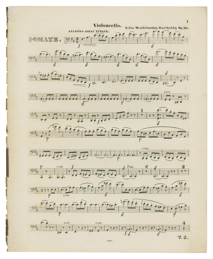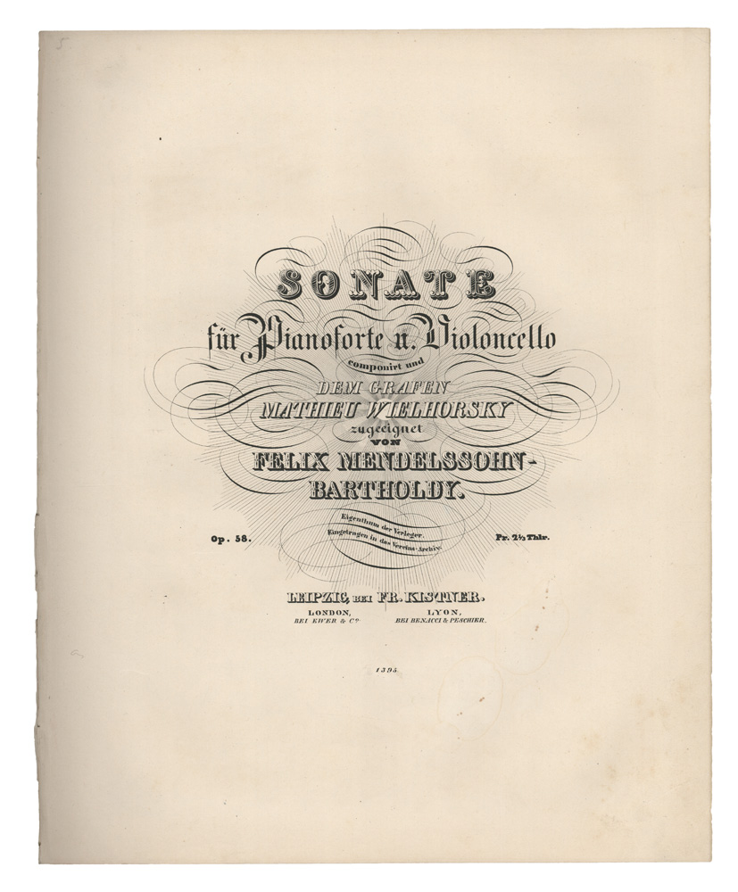 SONATE / für Pianoforte u. Violoncello / componirt und / DEM GRAFEN / MATHIEU WIELHORSKY / zugeeignet / von / FELIX MENDELSSOHN - BARTHOLDY. / Op. 58.