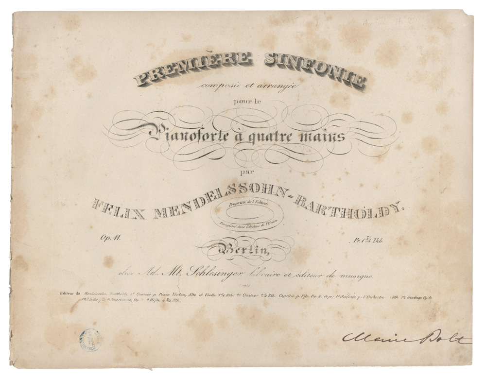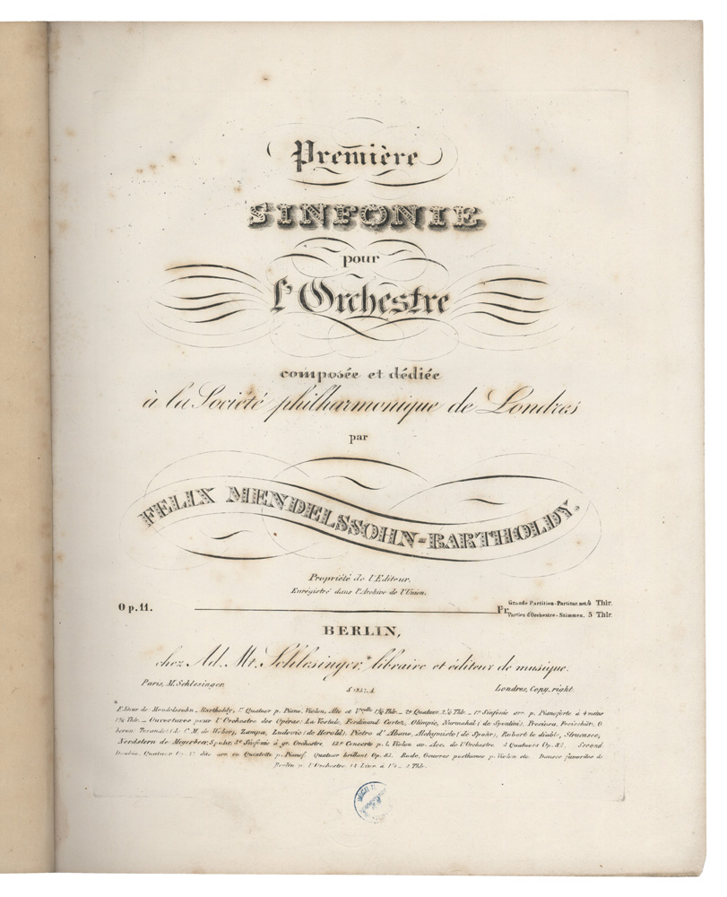 Première / SINFONIE / pour / L’ Orchestre / composée et dédiée / à la Societé philharmonique de Londres / par / FELIX MENDELSSOHN-BARTHOLDY. / Op.11