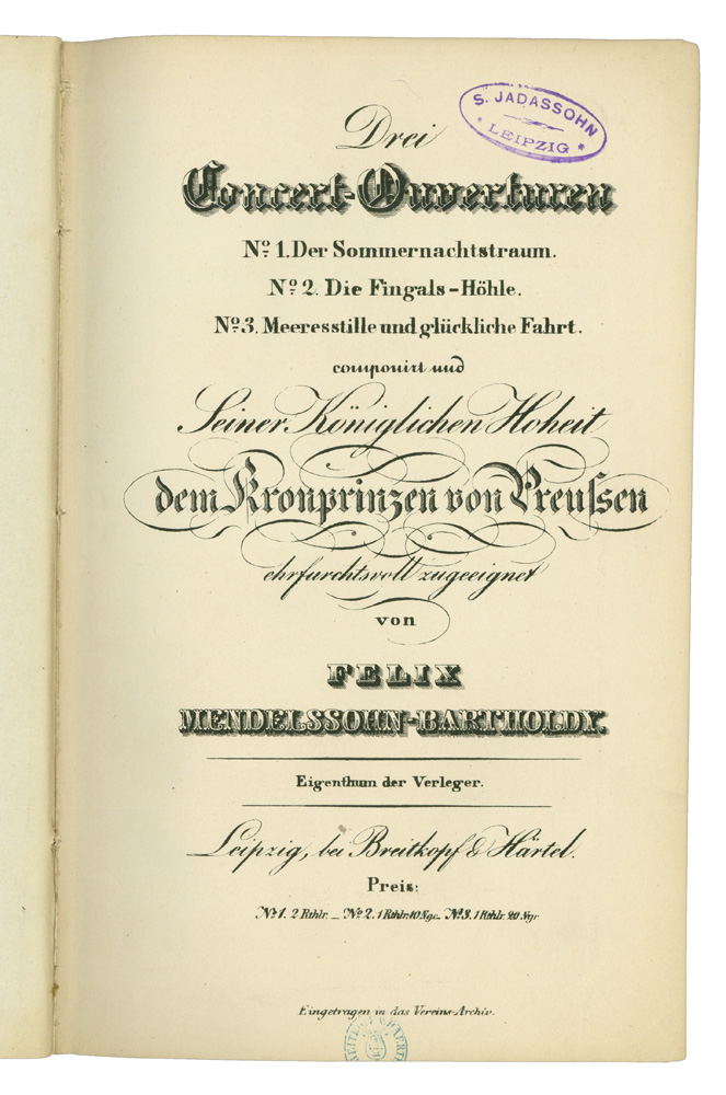 Drei / Concert-Ouverturen / N°. 1. Der Sommernachtstraum. / N°. 2. Die Fingals-Höhle. / N°. 3. Meeresstille und glückliche Fahrt. / componirt und / Seiner Königlichen Hoheit / dem Kronprinzen von Preussen / ehrfurchtsvoll zugeeignet / von / FELIX / MENDELSSOHN-BARTHOLDY.