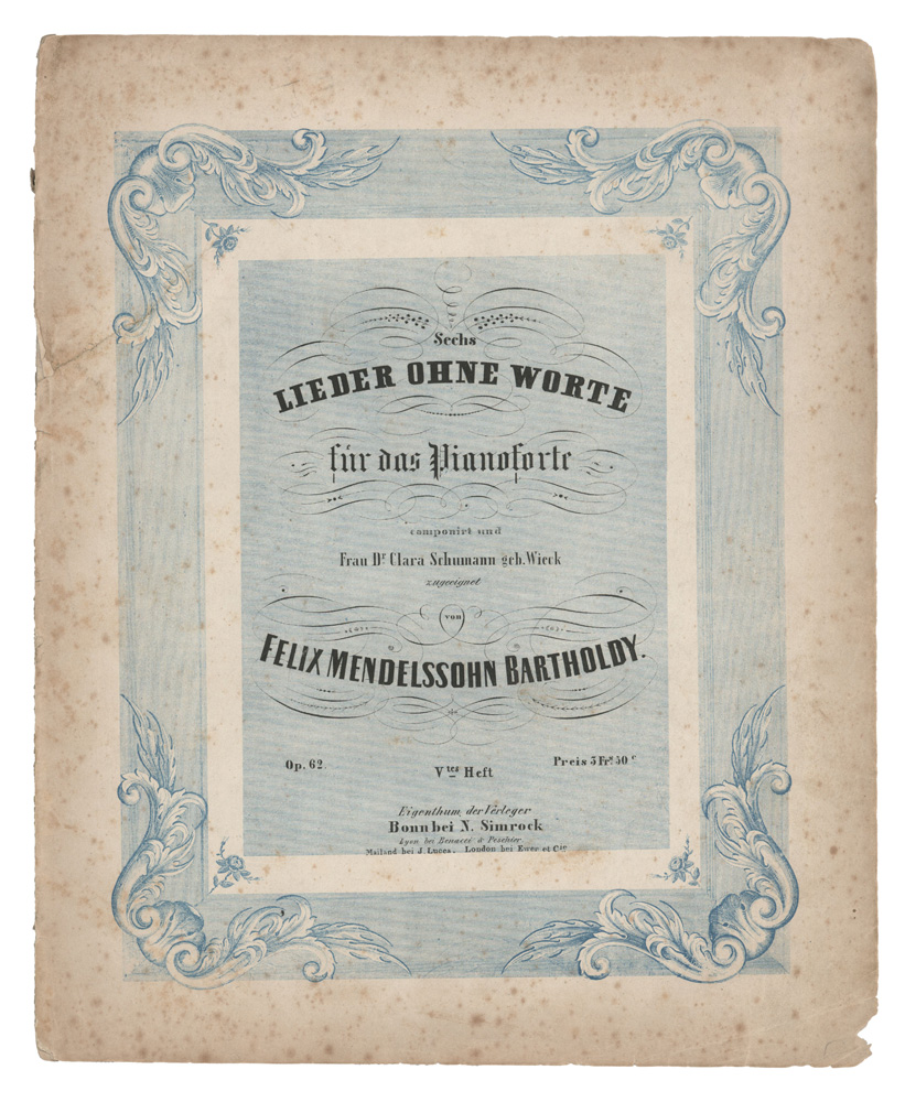 Sechs / LIEDER OHNE WORTE / für das Pianoforte / componirt und / Frau Dr. Clara Schumann, geb. Wieck / zugeeignet / von / FELIX MENDELSSOHN BARTHOLDY. / Op. 62. / Vtes Heft