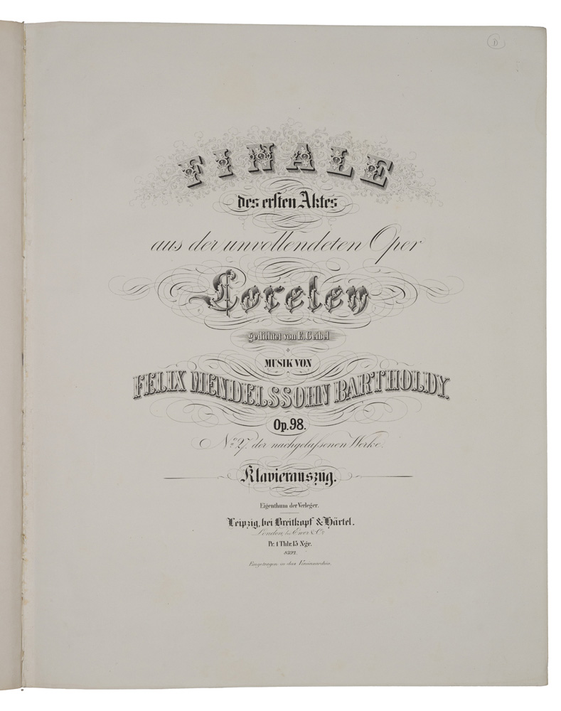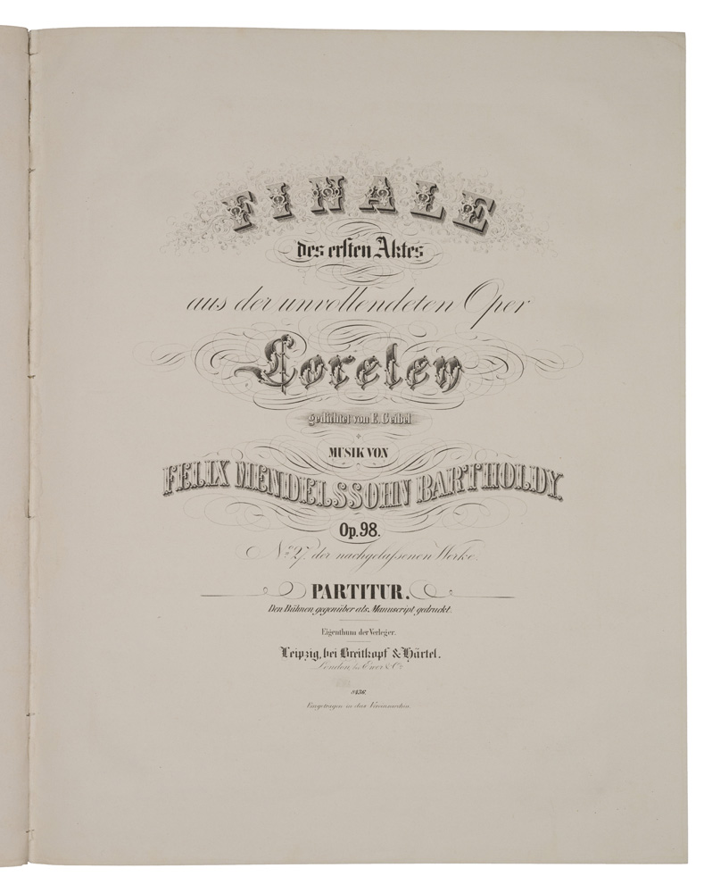 FINALE / des ersten Aktes / aus der unvollendeten Oper / Loreley / gedichtet von E. Geibel / MUSIK VON / FELIX MENDELSSOHN BARTHOLDY. / Op.98. / N° 27. der nachgelassenen Werke. / PARTITUR. / Den Bühnen gegenüber als Manuscript gedruckt.