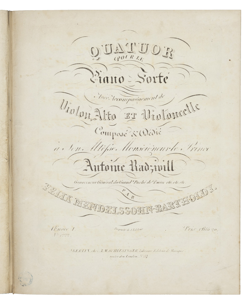 QUATUOR / POUR LE / Piano-Forté / Avec Accompagnement de / Violon,Alto ET Violoncelle / Composé & Dédié / à Son Messe Monseigneur le Prince / Antoine Radziwill / Gouverneur Général du Grand Duché de Posen etc. etc. etc. / PAR / FELIX MENDELSSOHN-BARTHOLDY. / Œuvre 1.