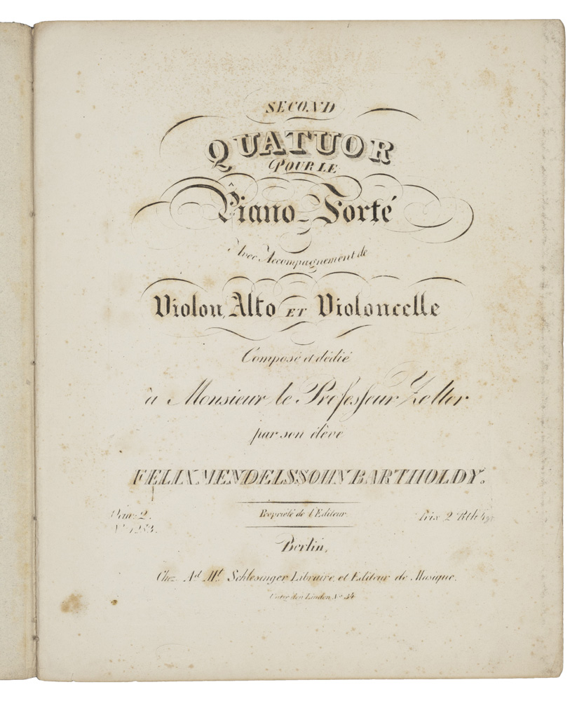 SECOND / QUATUOR / POUR LE / Piano Forté / Avec Accopagnement de / Violon Alto ET Violoncelle / Composé et dédié / à Monsieut le Professeur Zelter / par son élève / FELIX MENDELSSOHN BARTHOLDY. / Oeuv. 2.