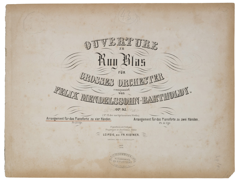 OUVERTURE / zu / Ruy Blas / FÜR / GROSSES ORCHESTER / componirt / von FELIX MENDELSSOHHN-BARTHOLDY. / OP.95 / (N°. 24 der nachgelassenen Werke.) / [links:] Arrangement für das Pianoforte zu vier Händen.
